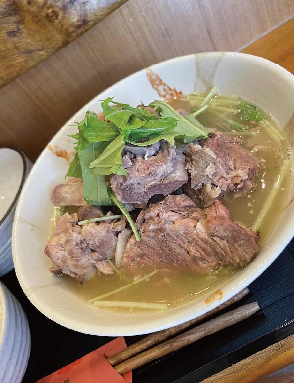 二軒目は沖縄そばのイチオシ店。観光客に人気の食べログ高評価店から地元で愛され続ける老舗店まで、50軒以上を食べ歩きましたが、最近のイチオシは壺屋にある「宮古そばSAIGA」。店名の通り沖縄そばの店ですが、お目当てはワーブニ汁。宮古島の方言でワー(ゥワー)は豚、ブニは骨のことらしく、メニューには“骨汁”とあります。宮古島風の豚汁ともいわれますが、ここの具材は肉のみ。テールスープをイメージすると分かりやすい感じです。無添加にこだわり手間暇かけたスープは抜群に美味い。ご飯付きでボリュームも満点です。残ったスープで頂く沖縄そばがまた堪らないのです。