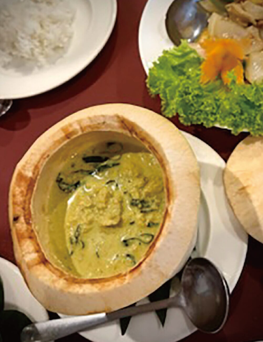 日本ではあまり使われない生姜科の香辛料ガランガルやカファライム(コブミカン)などのハーブ、ナンプラー特有の風味がたまらない一品で、見た目はほぼココナッツカレー。ちょっと違うのは卵とじ風になっていること。ご飯にかけて食べますが、カレーの香りが食欲をそそり、ホロホロのお魚に甘めのソースがよく合って美味しいです。地元で大人気なのも頷けます。