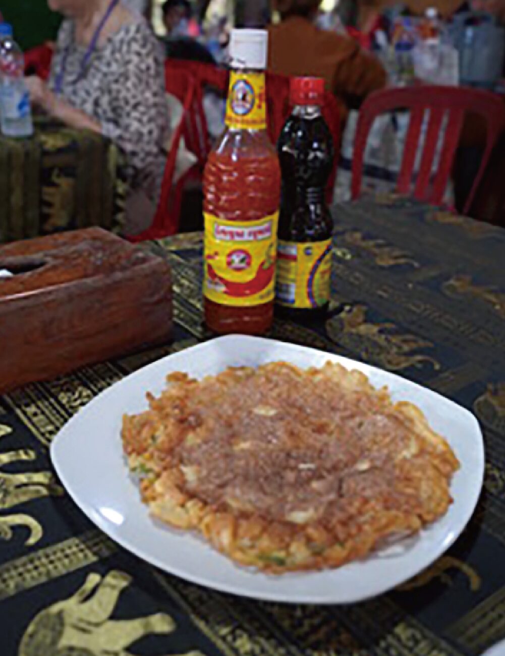 カンボジア風のお好み焼き「バインチャエウ」やスープ、そしてメインはカンボジアの代表的な牛肉料理「ロックラック」をいただきました。サイコロ状の牛肉を使うのが一般的ですが、こちらは食べやすい薄切り。これを炒めてオイスターソースや醤油などで甘辛く味付けされたお料理です。ベトナムの植民地時代に伝わった「ボー・ロック・ラック」が起源とされていますが、カンボジア流はライム果汁に塩、そして胡椒がたっぷり入ったソースを付けて食べるのが特徴的。さっぱりとした中に胡椒のパンチが効いていて美味いです。これは日本人にも好まれそう。新メニューになるかなぁ⁈