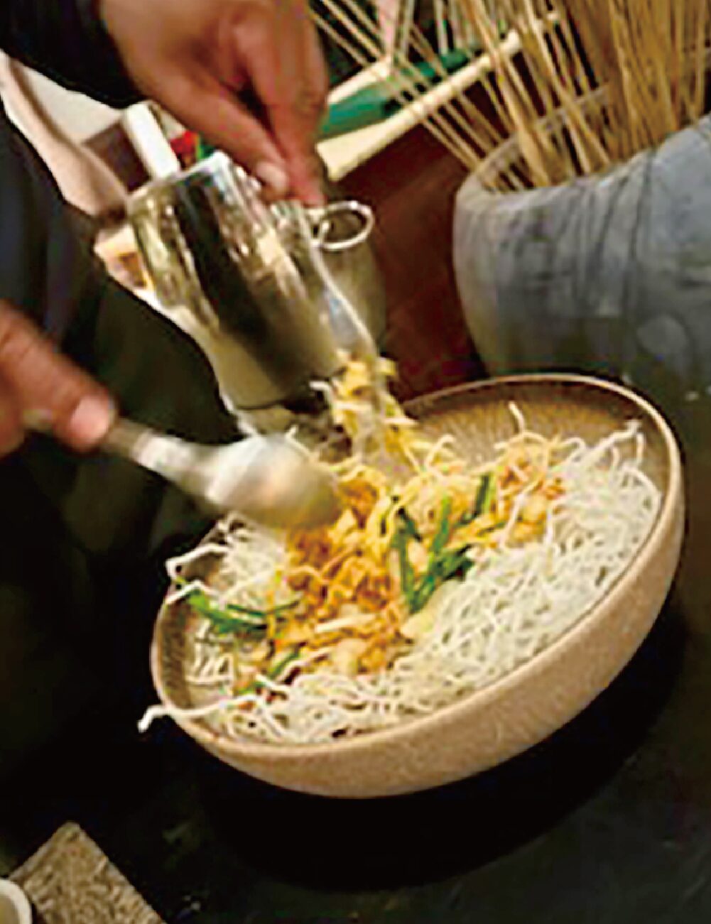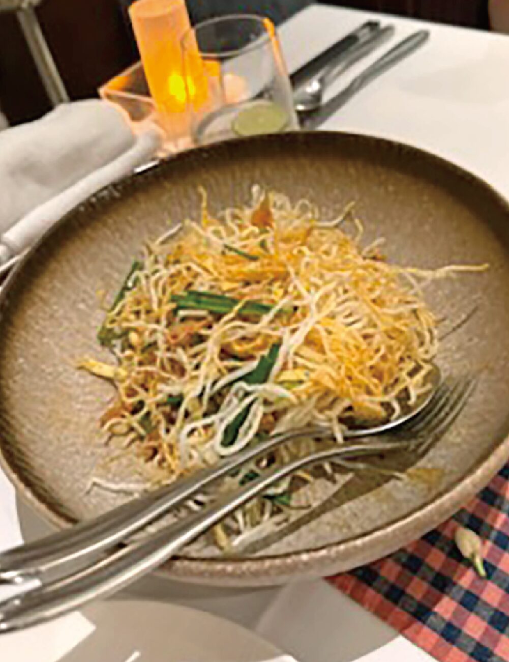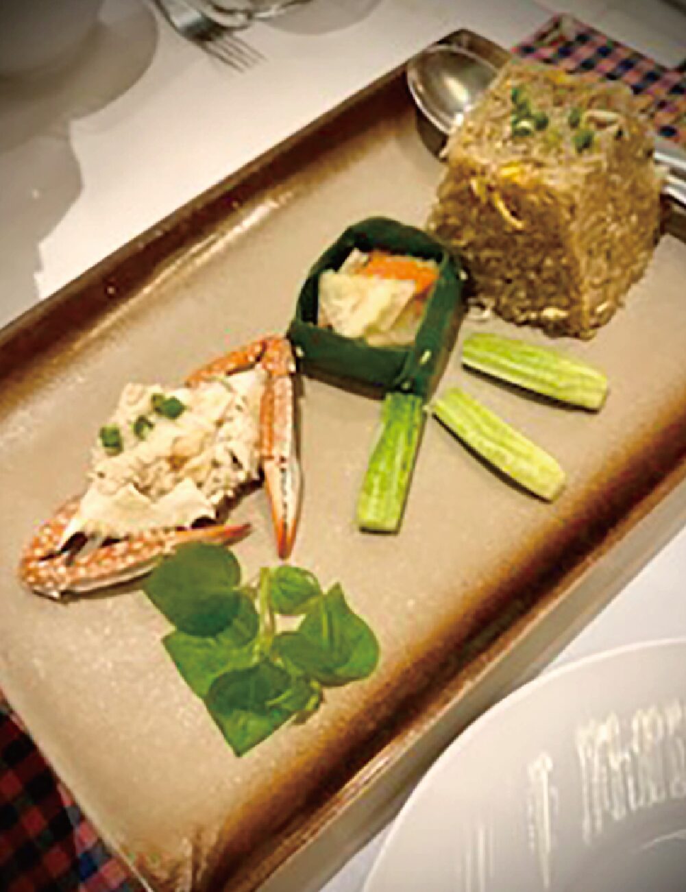 この店のスペシャリテの一つ「ロイヤル・マック・ミー」は印象に残った一品。カンボジア王宮に由来する伝統的な麺料理らしく、カリカリに揚げた麺に、ハーブとスパイスをすり潰して作った万能ペースト”クルーン”でマリネした豚肉、野菜などを和えた風味豊かな前菜です。スタッフがテーブル横で混ぜ合わせて仕上げてくれるスタイルもいい感じです。