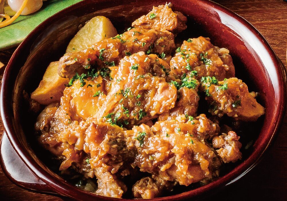チキンアボドはフィリピンの代表的な家庭料理の一つ。「アボド」とは「漬け込む」を意味する言葉で、スペイン植民地時代に伝わった料理法が起源と言われています。お酢を主体にした調味料で煮込むお料理で、和食でいえば鶏のお酢煮に近いお味で、日本人にも馴染みやすい一品です。現地ではご飯のおかずとして大変人気のあるメニューです。肉じゃが風にジャガイモでボリュームアップしたレシピをご紹介です。
