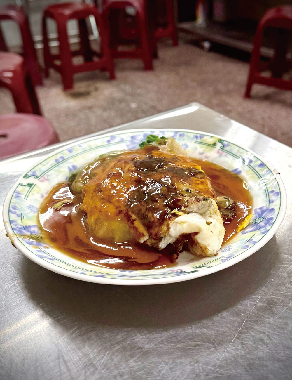 台湾最終日の朝は、水仙市場の食堂「石精臼蚵仔煎」からスタート。名物の牡蠣オムレツは、小粒の牡蠣とでんぷんを混ぜたモチモチの生地を卵で包み、甘い餡掛けソースをたっぷりとかけていただく一品。餅のような食感は初体験でしたが、すっかり気に入りました。