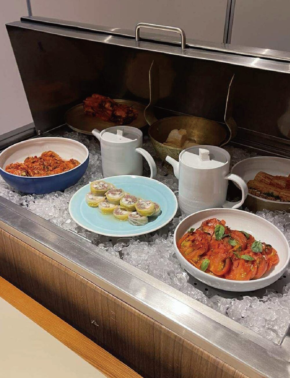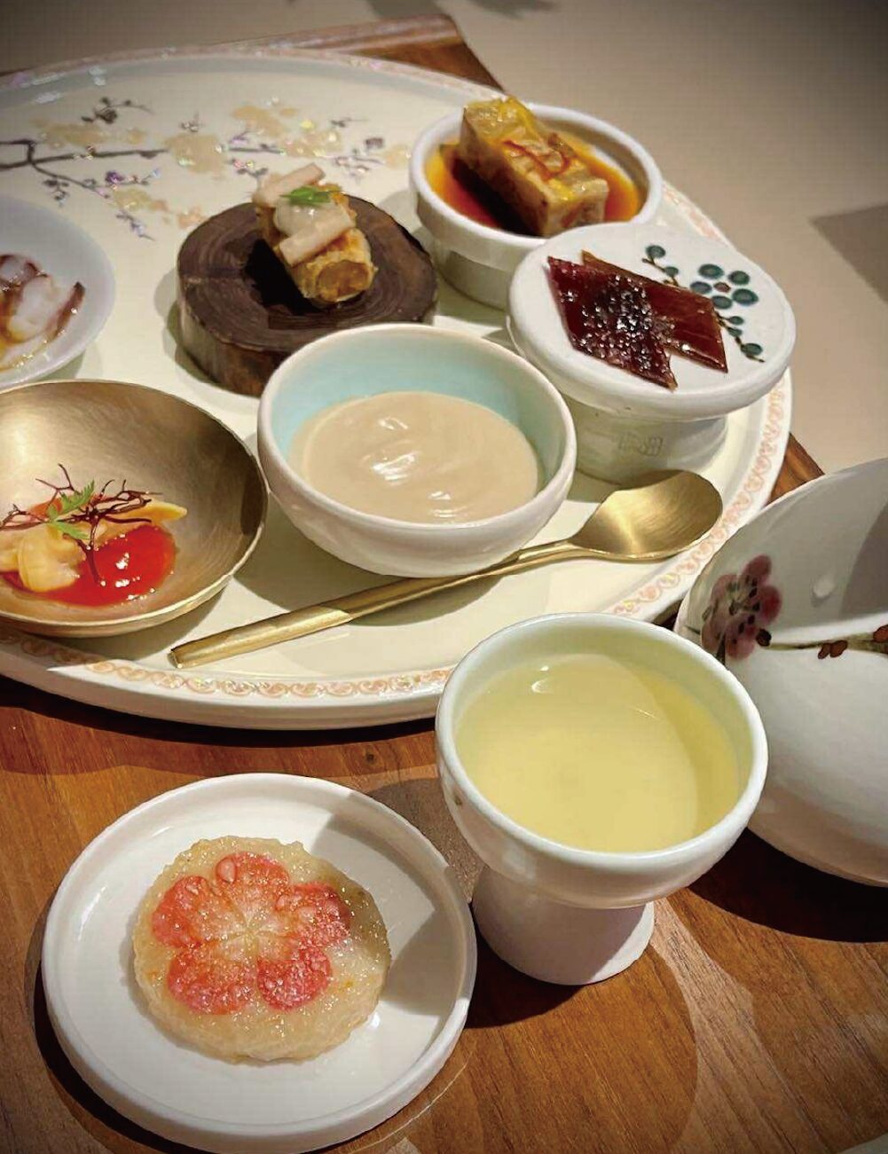 中でも朝鮮王朝時代に、王様の公式な食事とは別に来客を歓待する際に出されたお酒と肴の膳、「酒案床(チュアンサン)」をイメージしたという前菜が素晴らしかった。豆皿に盛られたお料理の数々、合わせて提供された日本酒のような伝統酒がまたベストマッチで感服しました。
